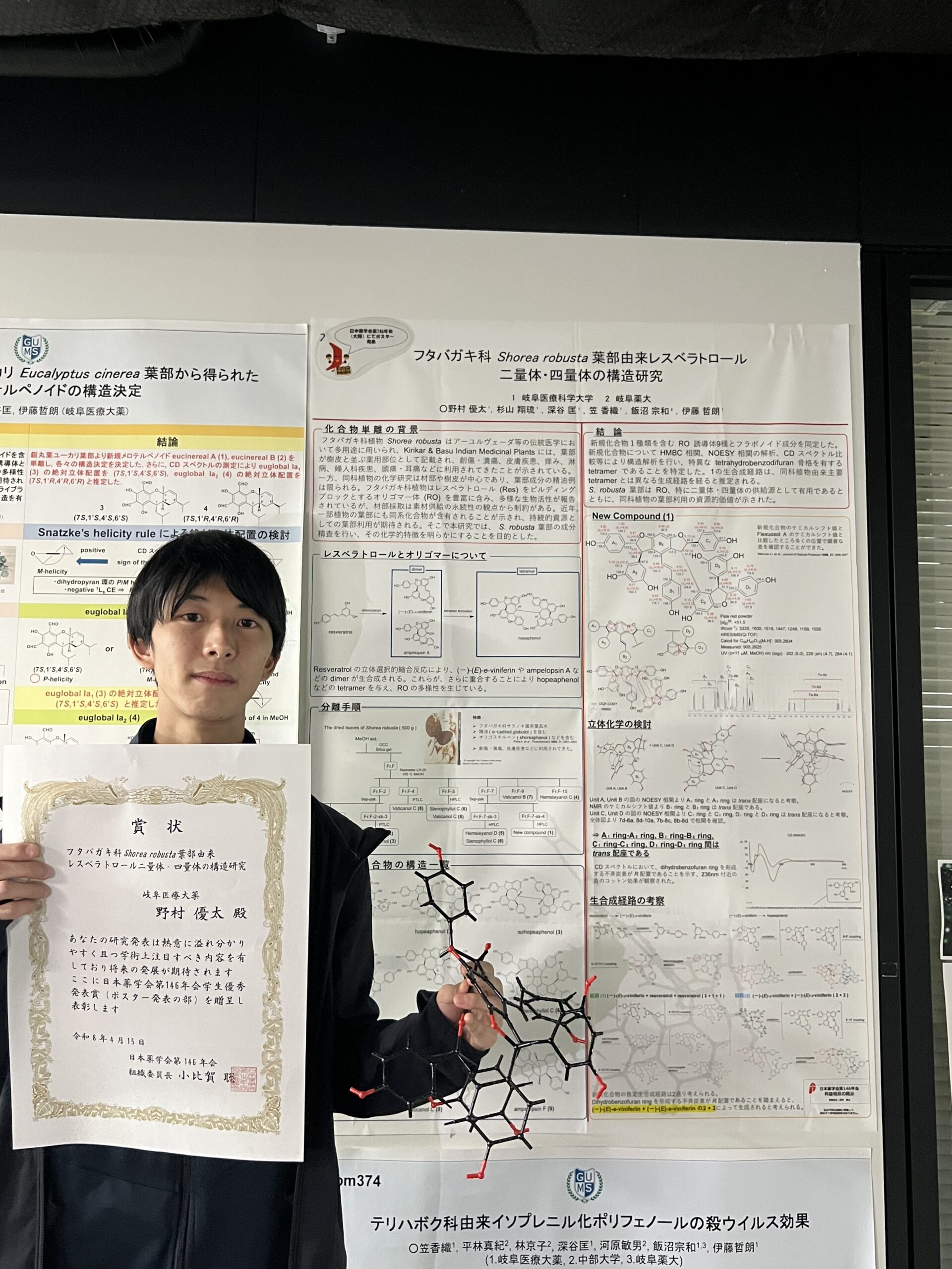 日本薬学会第146年会での受賞後、薬学棟内に掲示されたポスターの前で賞状を手にする野村優太さん