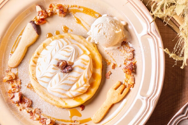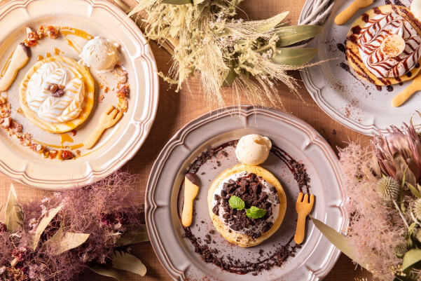プレーン・チョコバナナ・キャラメルの3種類から選べるパンケーキ