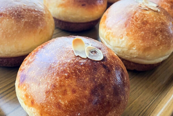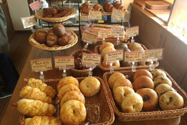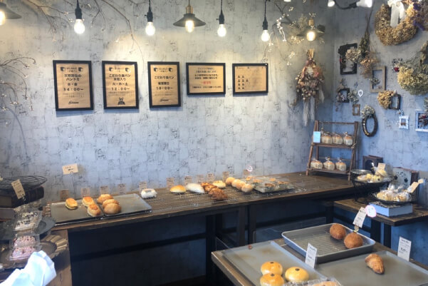 町の小さなパン屋さんです。店内のパンには国産小麦粉、無添加生地を使用。小さなオーブンで少しずつ焼きたてを出しています。焼きたてが提供できるように工夫されていて、どのパンを買うか目移りしていまいます!