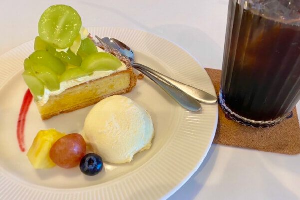 オムライスの中のチキンライスは優しい味付けで、ソースとのバランスが絶妙でした。デザートのシャインマスカットのタルトは、ふんだんにシャインマスカットが使用されていて、美味しかったです!