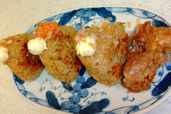 バターと鰹節をのせたものを基本の焼きおにぎりとし、トッピングで明太子か豚肉が選べます! (豚肉の場合は肉巻きおにぎりにして提供します) フツーにおいしいと思うので、ぜひ!食べに来てください!! -