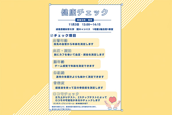 臨床検査学科と放射線技術学科が合同で健康チェックを開催します。 関キャンパス1号館2階の合同1の教室で13時から行う予定です。