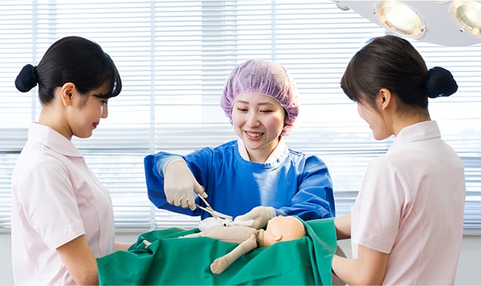 助産師は、正常分娩であれば、医師の指示がなくとも助産行為を行えます。また、「助産院」の開業ができたりと、キャリアの幅を広げられるのも特徴といえるでしょう。助産師になるには、看護師免許の取得後、1〜2年の専門課程を修了する必要があります。看護学部看護学科の卒業後、助産学専攻科への進学が可能な本学では、学び慣れた環境で助産師を目指せます。