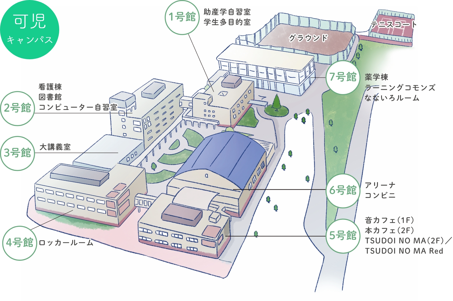 そのほか、講義室、パソコンルームがあり、看護学部学生は4年間の多くをこの棟で過ごすことになります。