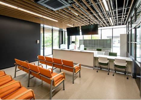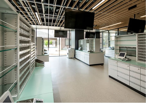 「OSCE(客観的臨床能力試験)」に対応するため、全面ガラス張りの1階に模擬薬局や調剤実習室、薬物治療管理室、模擬病室、